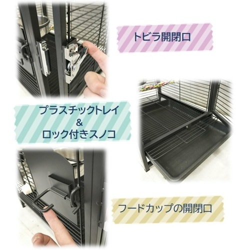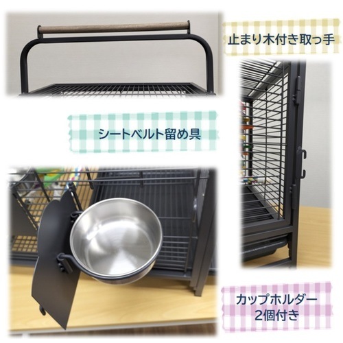 - 取っ手に留まり木があり、カラフルな【留まり棒】とステンレス食器付き。