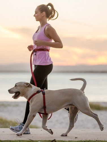 - 腰に巻くタイプのリード。ショック吸収機能付で犬の首や飼い主への負担が軽減されるリード。