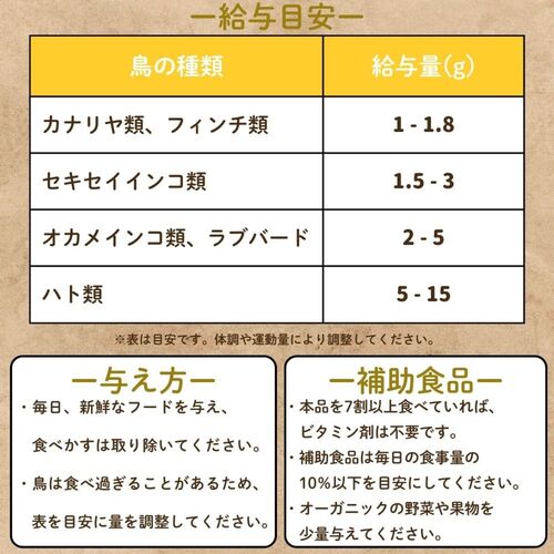 - 鳥類の健康を念頭に置いた鳥獣医師や栄養士によって作られた、USDA(米国農務省)認定のオーガニック素材配合の製品です。