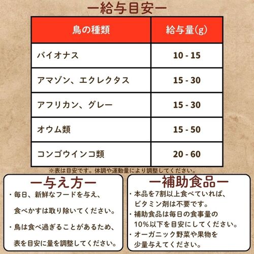 - 鳥類の健康を念頭に置いた鳥獣医師や栄養士によって作られた、USDA(米国農務省)認定のオーガニック素材配合の製品です。