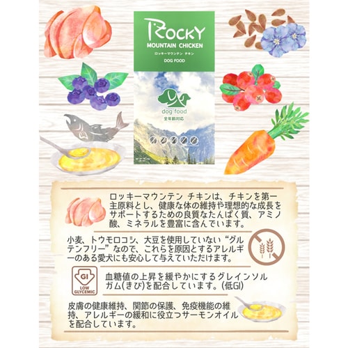 - ロッキーマウンテン チキンはチキンを第一主原料とし、健康な体の維持や理想的な成長をサポートするための良質なたんぱく質、アミノ酸、ミネラルを豊富に含んだドッグフードです。