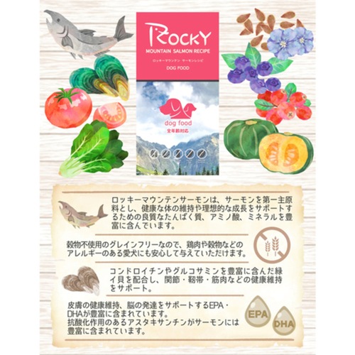 - ロッキーマウンテン サーモンレシピはサーモンを第一主原料とし、健康な体の維持や理想的な成長をサポートするための良質なたんぱく質、アミノ酸、ミネラルを豊富に含んでいます。