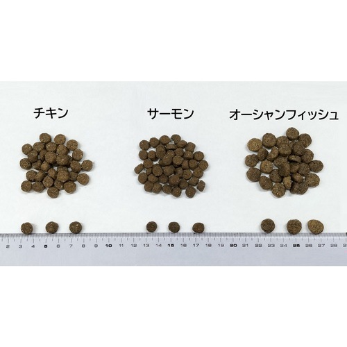 サーモン、サーモンミール、ホワイトフィッシュミール、キャノーラ油、スイートポテト、黄エンドウ豆、青エンドウ豆、ニシンミール、亜麻仁、ココナッツミール、天然香料、緑イ貝、海塩、ケルプミール、乾燥ブルーベリー、乾燥ビート、乾燥クランベリー、乾燥カボチャ、乾燥ホウレンソウ、乾燥トマト、たら肝油、イヌリン、乾燥カモミール、エンドウ豆繊維、塩化コリン、塩化カリウム、亜鉛アミノ酸複合体、ビタミンEサプリメント、硫酸亜鉛、鉄アミノ酸複合体、硫酸鉄、ナイアシンサプリメント、銅アミノ酸複合体、硫酸銅、マンガンアミノ酸複合体、ビタミンAサプリメント、チアミン硝酸塩、パントテン酸カルシウム、リボフラビンサプリメント、塩酸ピリドキシン、酸化マンガン、ビオチン、ビタミンB12サプリメント、ビタミンD3サプリメント、エチレンジアミンジヒドロヨウ化物、葉酸、セレン酸ナトリウム、ヨウ素酸カルシウム、ローズマリーエキス、タウリン、ラクトバチルスアシドフィルス発酵物、ラクトバチルスラクチス発酵物、ラクトバチルスパンタラム発酵物、バチルス・サブティリス発酵物、アスペルギルスオリゼ発酵物
