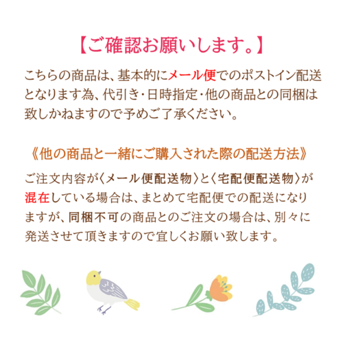 - 【この商品は、基本的にメール便での発送となる為、代引き・日時指定・他の商品との同梱は致しかねますので予めご了承ください。】 《複数ご購入された際の配送方法》メール便のみのご注文の場合はポストイン配送になりますが、メール便配送物と宅配便配送物が混在したご注文の場合はまとめて宅配便での配送になります。また他の商品との同梱が不可の商品とのご注文の場合は別々に発送させて頂きます。