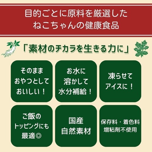 - 皮膚・被毛の健康をサポートするため高麗人参など自然由来の原料を独自配合した猫の健康食品