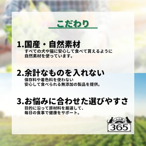 国産鶏むね肉、鶏レバー、寒天、こんにゃく、鮭、鯛だし、クマザサ末、スギナ末、高麗人参末、ヨモギ末、ドクダミ末