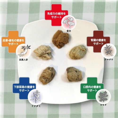 国産鶏むね肉、鶏レバー、寒天、こんにゃく、鮭、鯛だし、クマザサ末、スギナ末、高麗人参末、ヨモギ末、ドクダミ末