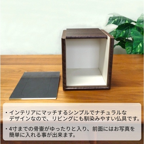 - 4寸までの骨壷がゆったりと入り、前面にはお気に入りの写真を簡単に入れる事ができます。