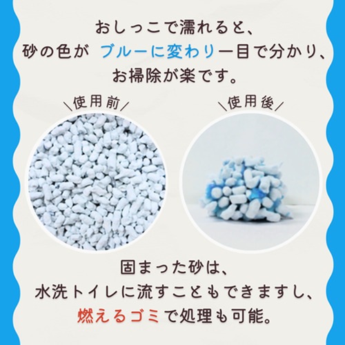 - おしっこがかかると猫砂の色がブルーに変わるので、汚れたところがしっかり判って衛生的です。
