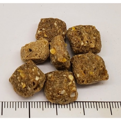 トウモロコシ、挽き割り裸麦、大豆、エンドウ豆、レンズ豆、挽き割りピーナッツ、挽き割りヒマワリ種、焙煎オーツ麦、玄米、アルファルファ、オオバコ、赤唐辛子粉、炭酸カルシウム、ベントナイト、混合トコフェロール(主成分:ビタミンE)、昆布、塩、藻類ミール、ビタミン/ミネラル類(パルミチン酸ビタミンA、ビタミンD3、DL-アルファ酢酸トコフェロール、ビタミンB12、リボフラビン、D-パントテン酸カルシウム、ナイアシン、塩酸ピリドキシン、ビオチン、チアミン硝酸塩、葉酸、硫酸亜鉛、硫酸マンガン、硫酸銅、セレン酸ナトリウム、炭酸カルシウム、ひまわり油)