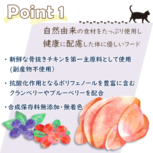 - 厳選した新鮮な骨抜きチキンを第一主原料として使用したキャットフードです。