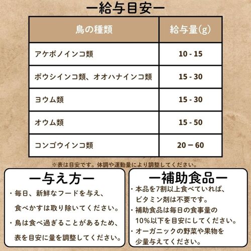 • 鳥類の健康を念頭に置いた鳥獣医師や栄養士によって作られた、USDA(米国農務省)認定のオーガニック素材配合の製品です。