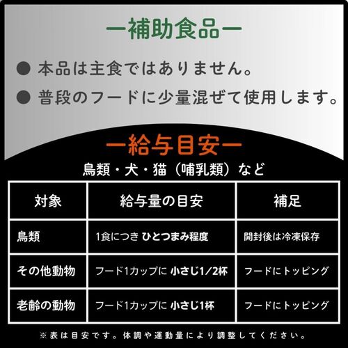 鳥類:一食にひとつまみ(小さじ1/16)。開封後は冷凍庫で保存してください。
