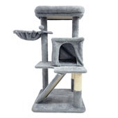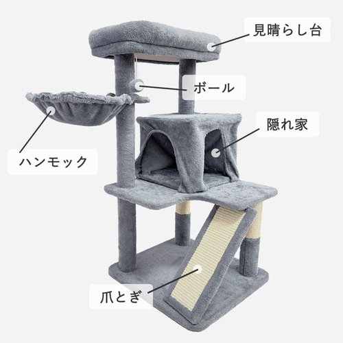 - ハンモック付きのキャットタワーで、ハンモックの近くにはボールおもちゃを配置しています。くつろぎながらボールに触れて遊ぶこともできます。